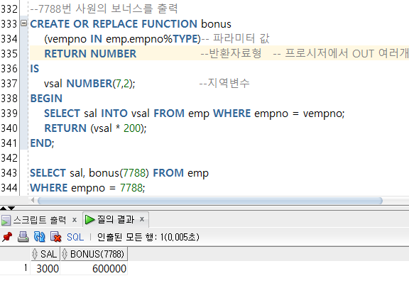 -- ํ๋ก์์ ์์ OUT ์ฌ๋ฌ๊ฐ ์ฌ์ฉํ ์ ์์ง๋ง, ์ ์ฅํจ์๋ RETURN ํ๋