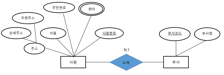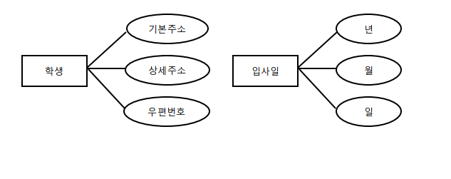 - ๋ณตํฉ ์์ฑ(Composite Attribute) : ๋ช ๊ฐ์ ๊ธฐ๋ณธ์ ์ธ ๋จ์ ์์ฑ์ผ๋ก ๋ถํด ํ ์ ์๋ ์์ฑ์ด๋ค.