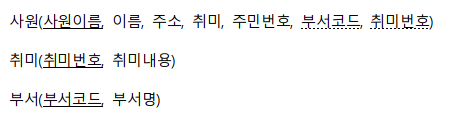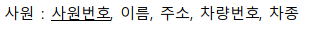 โ ์ฌ์ : ์ฌ์๋ฒํธ, ์ด๋ฆ, ์ฃผ์(์ฐํธ๋ฒํธ ์์ธ์ฃผ์), ์์๋ถ์๋ช , ์ทจ๋ฏธ(์ฌ๋ฌ ๊ฐ์ง ์ทจ๋ฏธ), ์ฃผ๋ฏผ๋ฒํธ