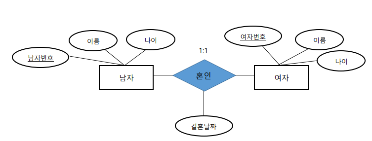 ex) ์ ๋๊ณผ ์ ๋ถ ์ฌ์ด์ ๊ฒฐํผ ๊ด๊ณ๋ฅผ ๋ค ์ ์๋ค. 1๋ช ์ ์ ๋์ด 1๋ช ์ ์ ๋ถ์ ๊ฒฐํผ ๊ด๊ณ๋ฅผ ๋งบ๊ธฐ ๋๋ฌธ์ด๋ค.