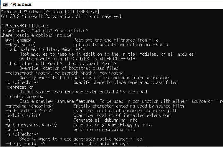 cmd ์์ javac ์ ๋ ฅํด๋ณด๊ณ ์ ์ค์น๋์๋์ง ํ์ธํ๋ค.