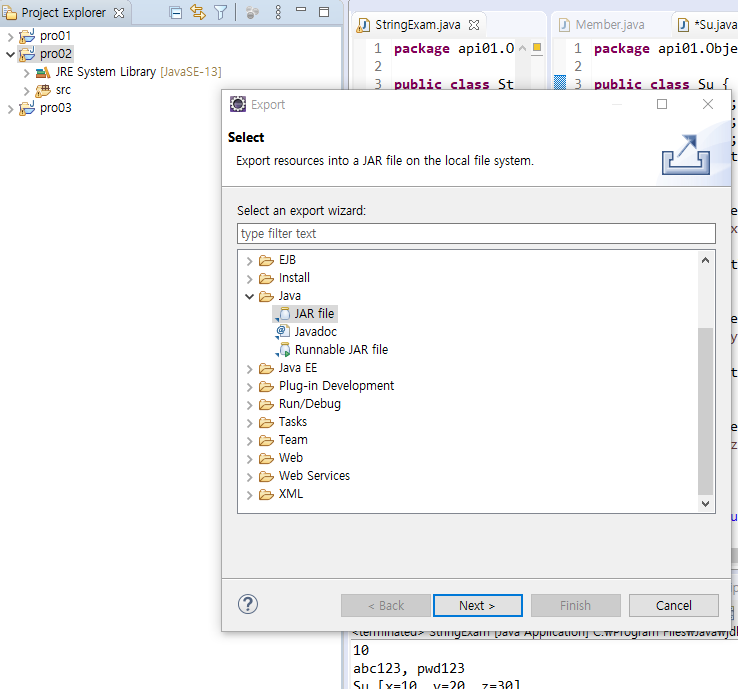 1. ํ๋ก์ ํธ ํด๋ ๋ง์ฐ์ค ์ค๋ฅธ์ชฝ ์ฐํด๋ฆญ > Export > Java > JAR file