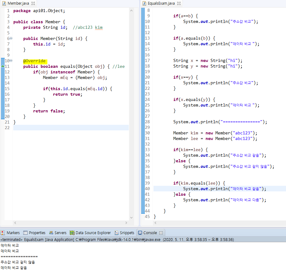 ๊ฐ์ฒด ๋น๊ต equals() : Object ํด๋์ค์ eqauls() ๋ฉ์๋๋ ๋น๊ต ์ฐ์ฐ์์ธ ==์ ๋์ผํ ๊ฒฐ๊ณผ๋ฅผ ๋ฆฌํดํ๋ค. ๋ ๊ฐ์ฒด๊ฐ ๋์ผํ ๊ฐ์ฒด๋ผ๋ฉด true๋ฅผ ๋ฆฌํดํ๊ณ ๊ทธ๋ ์ง ์์ผ๋ฉด false๋ฅผ ๋ฆฌํดํ๋ค.