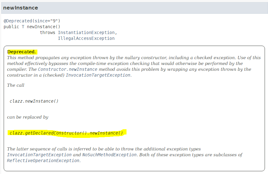 https://docs.oracle.com/en/java/javase/14/docs/api/java.base/java/lang/Class.html#newInstance()