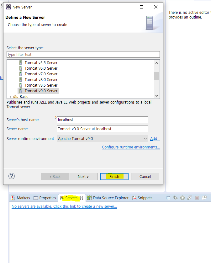 5. Server ํด๋ฆญํด์ ํ๋์ค ํด๋ฆญํ๋ฉด New Server ํด์ ๋ง๋ ๋ฒ์ ์ ํฐ์บฃ ์ ํํ๊ณ Finish