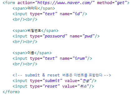 <!-- submit & reset ๋ฒํผ์ ์ด๋ฒคํธ๋ฅผ ํฌํจํ๋ค -->