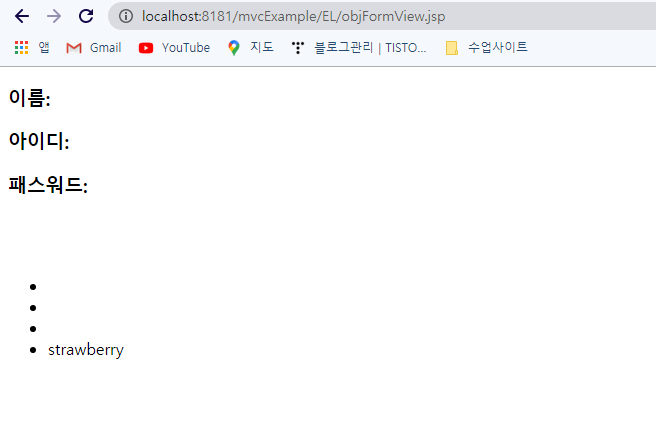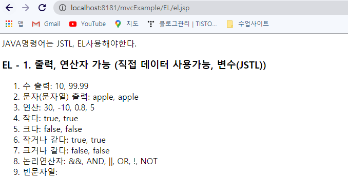 <h3>EL - 1. ์ถ๋ ฅ, ์ฐ์ฐ์ ๊ฐ๋ฅ (์ง์ ๋ฐ์ดํฐ ์ฌ์ฉ๊ฐ๋ฅ, ๋ณ์(JSTL))</h3>