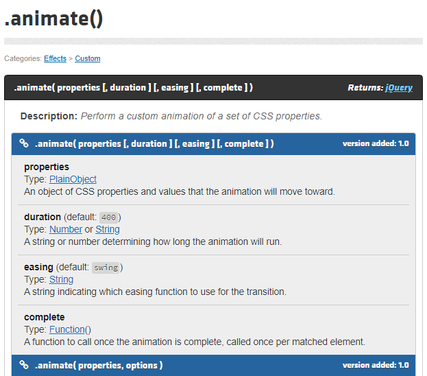 Description: Perform a custom animation of a set of CSS properties. The .animate() method allows us to create animation effects on any numeric CSS property. The only required parameter is a plain object of CSS properties. This object is similar to the one