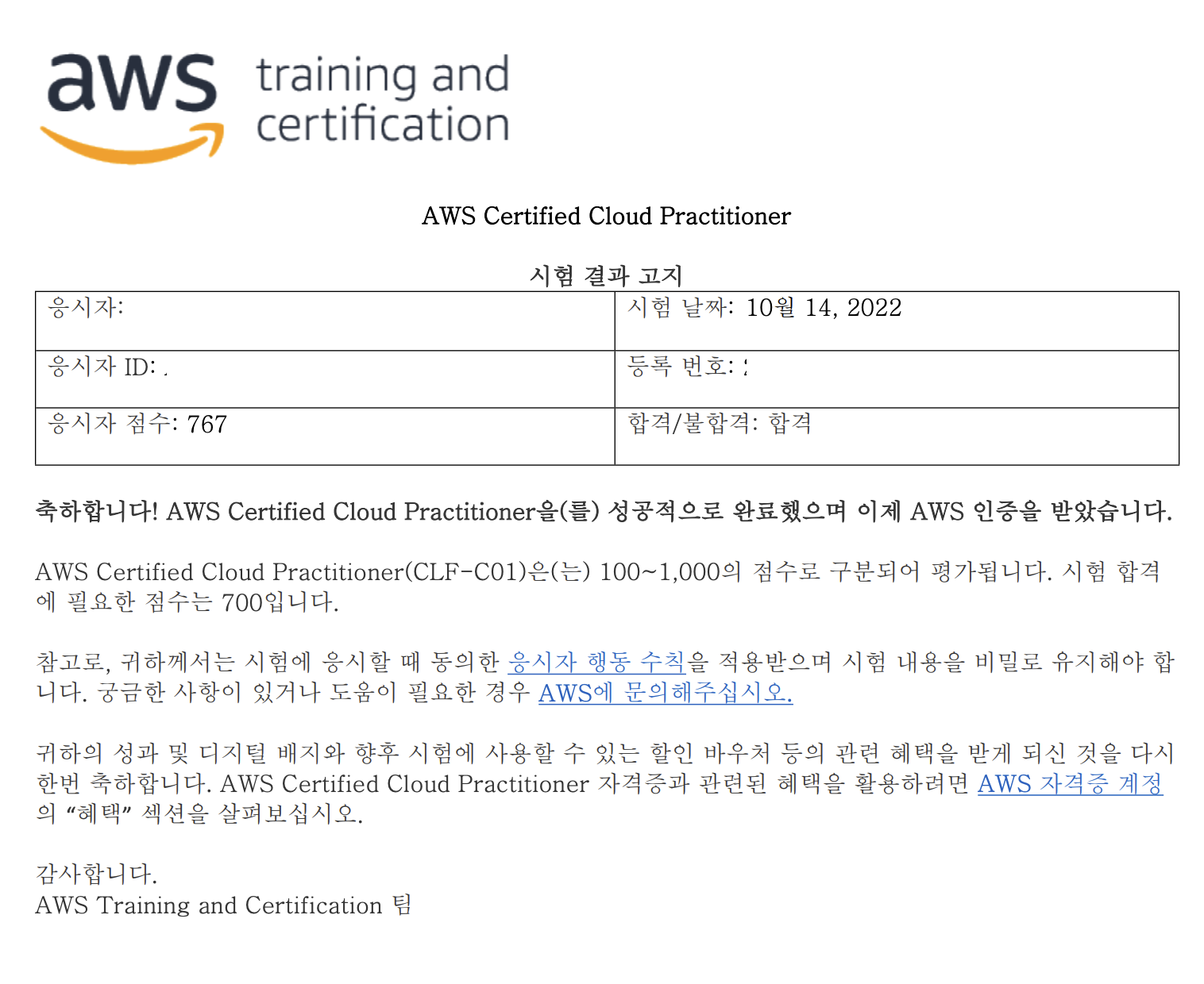 [์๊ฒฉ์ฆ] AWS Certified Cloud Practitioner (CLF-C01) ์ํ ํ๊ธฐ ๋ณธ๋ฌธ