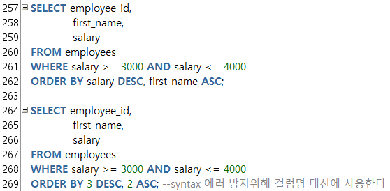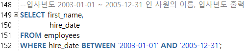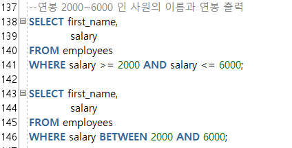 --BETWEEN a AND b : a์ b ์ฌ์ด์ ์๋ ๋ฒ์ ๊ฐ์ ๋ชจ๋ ๊ฒ์