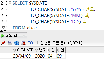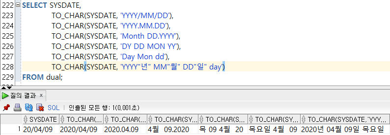 --1) TO_CHAR(๋ ์ง, ๋ ์งํ์) : ๋ ์งํ์ด ๋ฌธ์ํ์ผ๋ก ๋ณํ