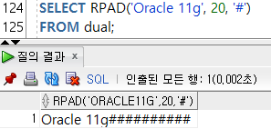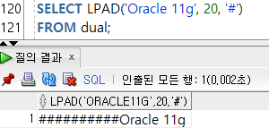 --2-8) LPAD(๋ฌธ์์ด, ์๋ฆฌ์, ์ฑ์ธ๋ฌธ์์ด) : ์ค๋ฅธ์ชฝ ์ ๋ ฌ ํ ์ผ์ชฝ์ ์๊ธด ๋น ๊ณต๋ฐฑ์ ํน์ ๋ฌธ์๋ฅผ ์ฑ์ด๋ค.