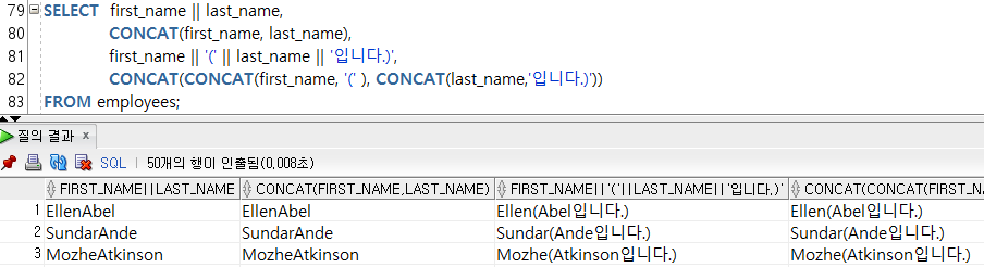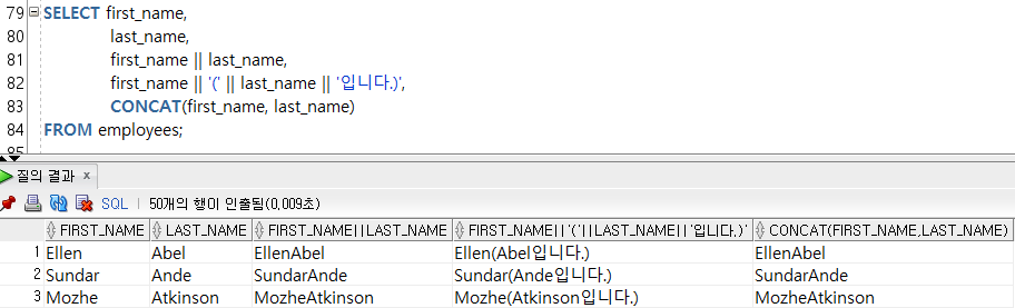 || ์ฐ์ฐ์๋ฅผ ์ฌ์ฉํด์ ๋ฌธ์๋ฅผ ์ฐ๊ฒฐํด๋ ๋๊ณ , CONCAT ํจ์๋ฅผ ์ฌ์ฉํด๋ ๋๋ค.