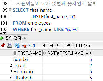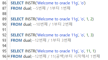 --2-6) INSTR(๋ฌธ์์ด, ์ฐพ๋๋ฌธ์, ์์์์น, ๋ช๋ฒ์งธ) : ํน์ ๋ฌธ์์ ์์น(๋ฐํ ์ซ์)
