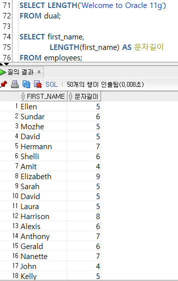 --2-4) LENGTH(๋ฌธ์ ๋๋ ๋ฌธ์์ด) : ๋ฌธ์์ด์ ๊ธธ์ด(๊ฐฏ์)๋ฅผ ๋ณํ