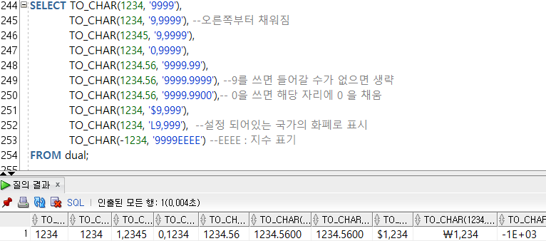 --2) TO_CHAR(์ซ์, ์ซ์ํ์) : ์ซ์ํ์ด ๋ฌธ์ํ์ผ๋ก ๋ณํ