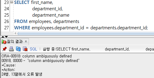 --NATURAL JOIN ๋ชปํจ. ๋ ํ ์ด๋ธ์ ์ด์ ์ด๋ฆ์ด 2๊ฐ ์ด์ ๊ฐ์ ๊ฒฝ์ฐ์๋ ์ฌ์ฉํ ์ ์๊ธฐ ๋๋ฌธ์